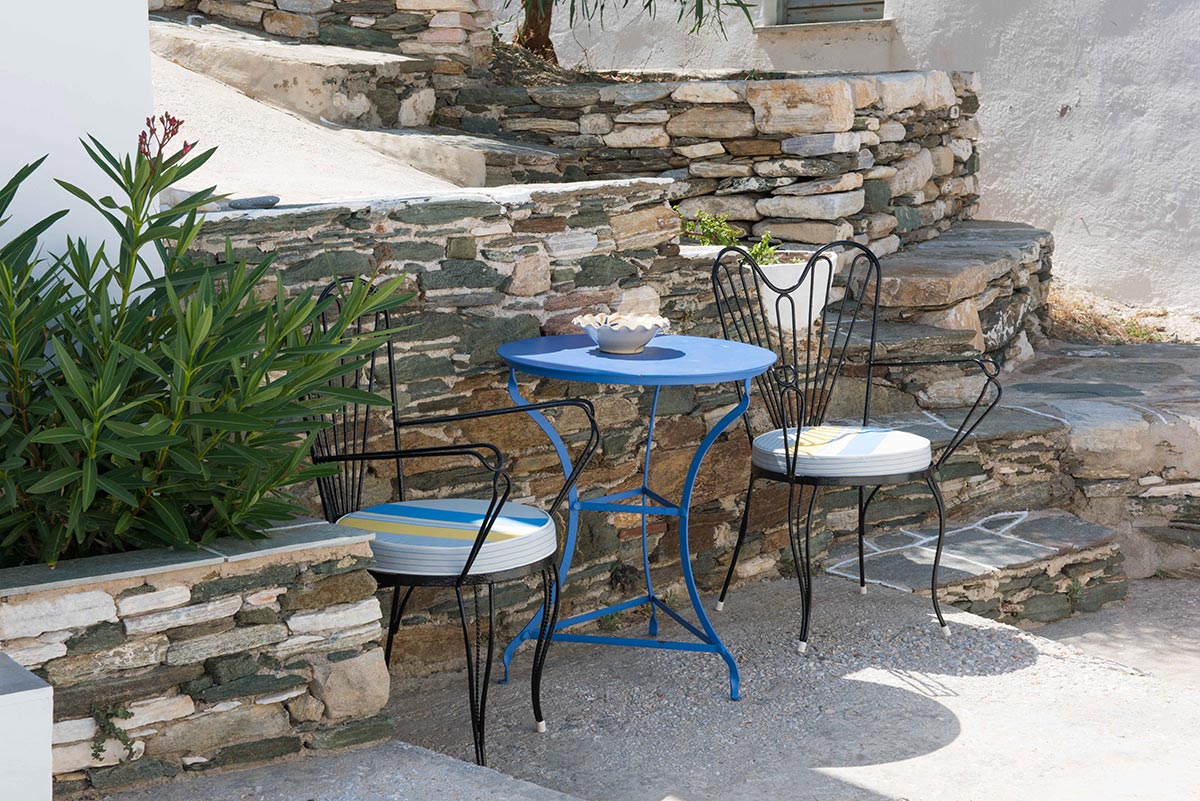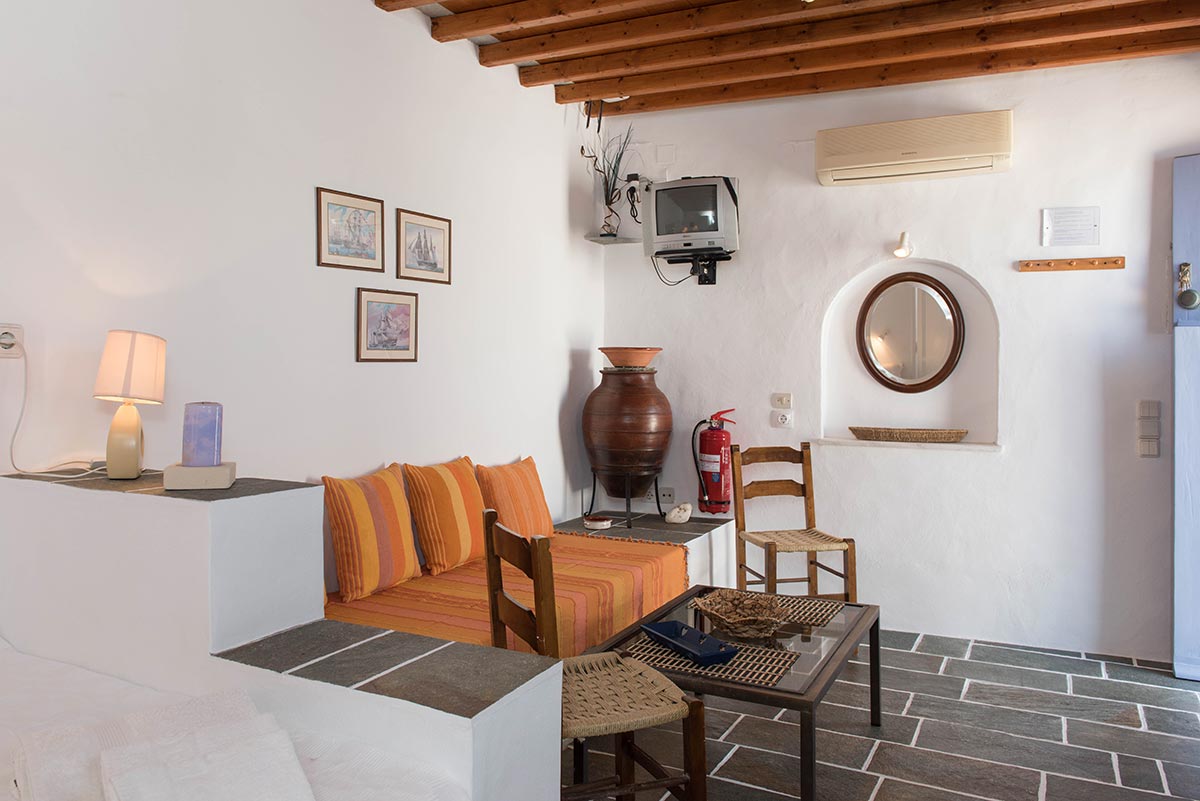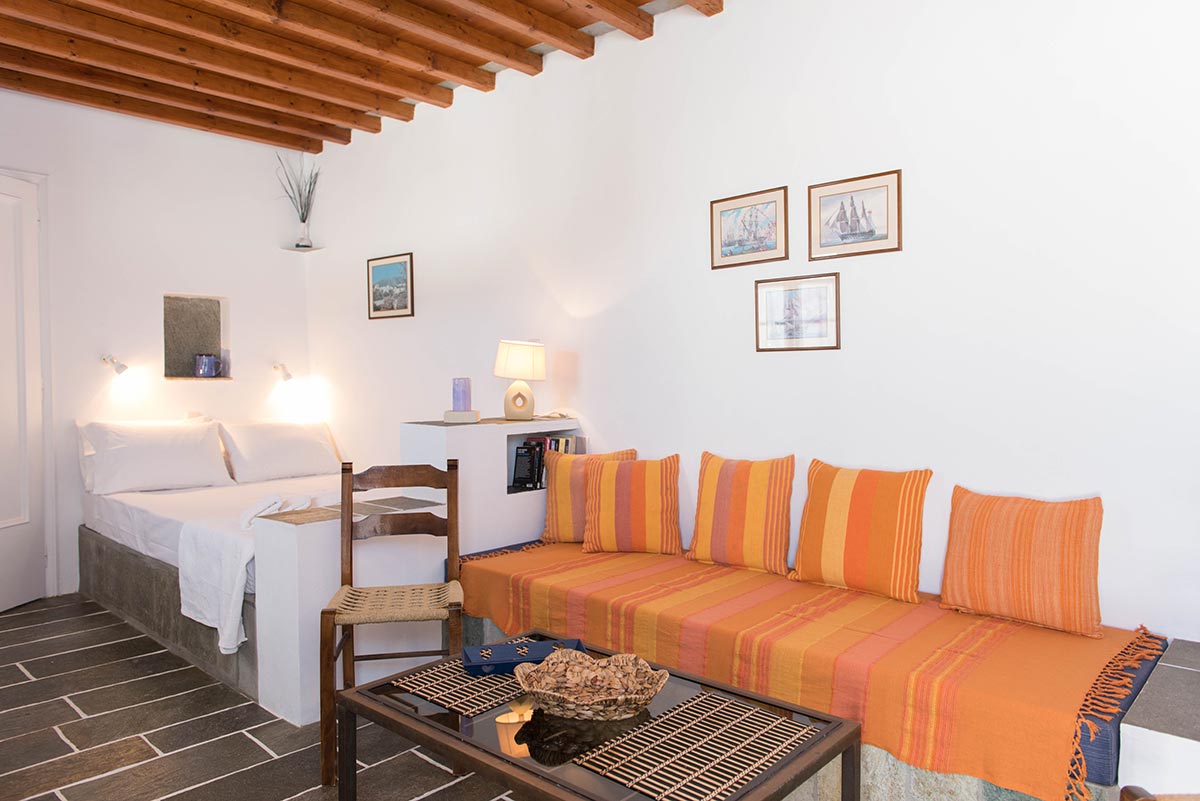 Το στούντιο είναι 25 τ.μ. κι αποτελείται από κρεβατοκάμαρα, χώρο καθιστικού, κουζίνα και μπάνιο. Διαθέτει μικρή βεράντα στο πλάι του σπιτιού. Η ταράτσα είναι διαμορφωμένη με χτιστό καναπέ και τραπέζι και προσφέρει θέα στη θάλασσα.
